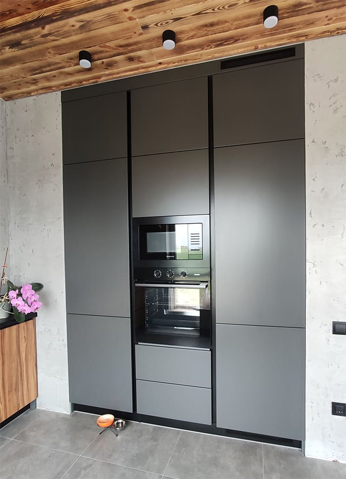 При изготовлении фасадов часто используем крашеное МДФ (красим в любой цвет по каталогу RAL, NCS). Также существует огромный выбор готовых панелей МДФ от таких производителей как Rehau, AGT, Luxeform. Они бывают на любой вкус и цвет: глянцевые и матовые, с текстурой и гладкие, с узором и однотонные.